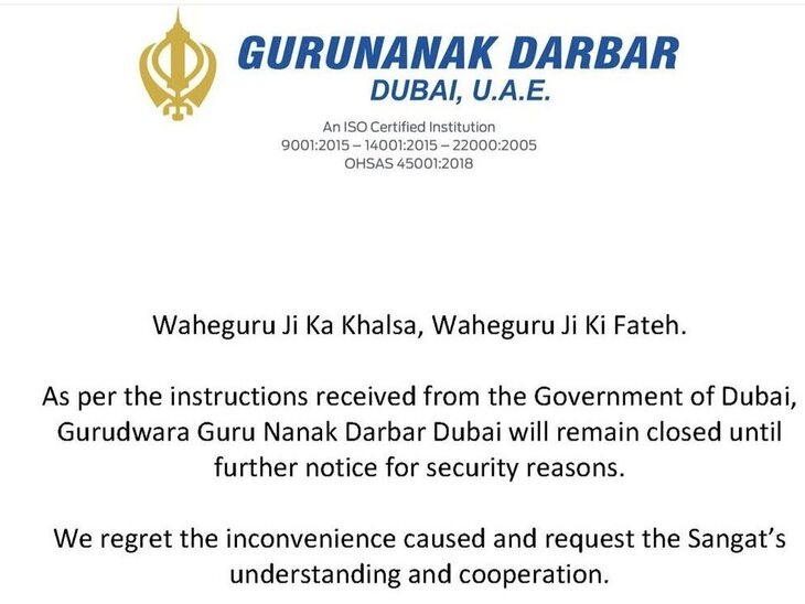 खाड़ी क्षेत्र में बढ़ते सैन्य तनाव और सुरक्षा जोखिमों के बीच दुबई सरकार ने जेबेल अली स्थित प्रतिष्ठित गुरुद्वारा गुरु नानक दरबार को अगले आदेश तक बंद करने लेटर भी जारी किया है। कम्युनिटी डेवलपमेंट अथॉरिटी (CDA) द्वारा यह फैसला ईरान और इजरायल-अमेरिका के बीच जारी युद्ध के चलते सुरक्षा कारणों से लिया गया है।