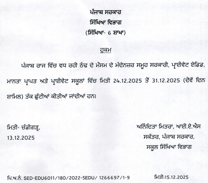 पंजाब सरकार के स्कूल शिक्षा विभाग की सचिव अनिंदिता मित्रा के मुताबिक यह आदेश सभी सरकारी स्कूलों के साथ प्राइवेट एडेड, मान्यता प्राप्त और प्राइवेट स्कूलों पर भी लागू होंगे। स्कूल 1 जनवरी को दोबारा खुलेंगे।