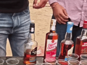 Buland kesari/पंजाब के कोटकपूरा में चैत्र नवरात्र पर शराब का लंगर चला। गांव मरहाना में बाबा काला महर के यादगार मेले में ये नजारा देखने को मिला। दरबार के बाहर बेंच लगाकर उस पर देसी और अंग्रेजी शराब की बोतलें सजाई गईं। श्रद्धालु टेबल पर ही पैग बनाकर रखते और पिलाते नजर आए।