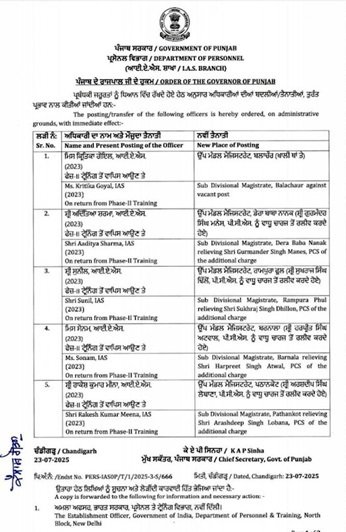 Buland kesari ;- मिली जानकारी के मुताबिक पंजाब सरकार ने IAS अधिकारियों का तबादला किया है। जिन अधिकारियों का तबादला किया गया है, उनमें आई.ए.एस. अधिकारी आदित्य शर्मा, कृतिका गोयल, सुनील सोनम और राकेश कुमार मीना शामिल हैं।