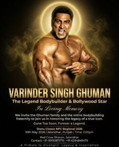 जालंधर/ पंजाब: फिटनेस और बॉडीबिल्डिंग की दुनिया के चमकते सितारे और बॉलीवुड अभिनेता स्वर्गीय वरिंदर सिंह घुमन की विरासत को सम्मान देने के लिए आगामी 10 मई 2026 (रविवार) को जालंधर में एक भव्य कार्यक्रम का आयोजन किया जा रहा है। शेरू क्लासिक NPC रीजनल 2026 के मंच पर इस ‘लीजेंड’ बॉडीबिल्डर को विशेष श्रद्धांजलि अर्पित की जाएगी।