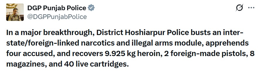 डीजीपी ने लिखा-जीरो टॉलरेंस नीति के तहत सख्त एक्शन लिया पंजाब डीजीपी गौरव यादव ने गिरोह के पकड़े जाने पर एक्स पर पोस्ट कर लिखा कि सीमा पार तस्करी रैकेटों पर जीरो टॉलरेंस नीति के तहत सख्त एक्शन लिया जा रहा है। इसके तहत पंजाब के होशियारपुर में पुलिस को नशा और हथियार तस्करी से जुड़े बड़े राकेट को पकड़ने में कामयाबी मिली है।