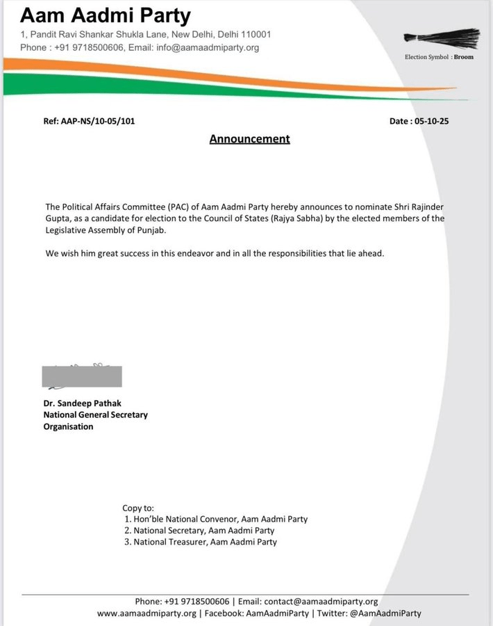 Buland kesari/RS bypoll from punjab; ਸੱਤਾਧਾਰੀ ਆਮ ਆਦਮੀ ਪਾਰਟੀ (ਆਪ) 24 ਅਕਤੂਬਰ ਨੂੰ ਪੰਜਾਬ ਵਿੱਚ ਹੋਣ ਵਾਲੀ ਰਾਜ ਸਭਾ ਉਪ ਚੋਣ ਲਈ ਉਦਯੋਗਪਤੀ ਰਾਜਿੰਦਰ ਗੁਪਤਾ ਨੂੰ ਆਪਣਾ ਉਮੀਦਵਾਰ ਬਣਾ ਸਕਦੀ ਹੈ। ਇਹ ਉਪ ਚੋਣ ‘ਆਪ’ ਦੇ ਸੰਜੀਵ ਅਰੋੜਾ ਦੇ ਅਸਤੀਫ਼ੇ ਕਾਰਨ ਖਾਲੀ ਹੋਈ ਸੀਟ ਨੂੰ ਭਰੇਗੀ। ਅਰੋੜਾ ਨੇ ਰਾਜ ਵਿਧਾਨ ਸਭਾ ਲਈ ਚੁਣੇ ਜਾਣ ਤੋਂ ਬਾਅਦ ਉੱਚ ਸਦਨ ਤੋਂ ਅਸਤੀਫਾ ਦੇ ਦਿੱਤਾ। ਸੰਜੀਵ ਅਰੋੜਾ, ਜਿਨ੍ਹਾਂ ਦਾ ਕਾਰਜਕਾਲ 9 ਅਪ੍ਰੈਲ, 2028 ਨੂੰ ਖਤਮ ਹੋਣਾ ਸੀ, ਇਸ ਸਮੇਂ ਭਗਵੰਤ ਮਾਨ ਦੀ ਅਗਵਾਈ ਵਾਲੀ ਪੰਜਾਬ ਕੈਬਨਿਟ ਵਿੱਚ ਮੰਤਰੀ ਹਨ।