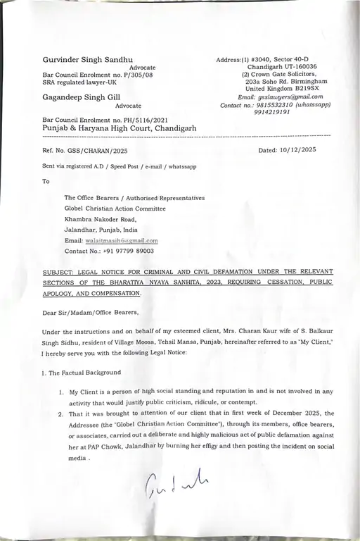 Buland kesari/Sidhu Mother News: ਜਲੰਧਰ ਵਿੱਚ ਸਿੱਧੂ ਮੂਸੇਵਾਲਾ ਦੀ ਮਾਂ ਚਰਨ ਕੌਰ ਦੇ ਪੁਤਲੇ ਨੂੰ ਸਾੜਨ ਦੇ ਮਾਮਲੇ ਨੇ ਇੱਕ ਨਵਾਂ ਮੋੜ ਲੈ ਲਿਆ ਹੈ। ਸਿੱਧੂ ਮੂਸੇਵਾਲਾ ਦੀ ਮਾਂ ਨੇ ਆਪਣੇ ਵਕੀਲ ਰਾਹੀਂ ਕ੍ਰਿਸ਼ਚੀਅਨ ਗਲੋਬਲ ਐਕਸ਼ਨ ਕਮੇਟੀ ਨੂੰ 10 ਲੱਖ ਰੁਪਏ ਦਾ ਕਾਨੂੰਨੀ ਨੋਟਿਸ ਭੇਜਿਆ ਹੈ। ਨੋਟਿਸ ਵਿੱਚ, ਸਿੱਧੂ ਦੇ ਪਰਿਵਾਰ ਦੀ ਨੁਮਾਇੰਦਗੀ ਕਰ ਰਹੇ ਵਕੀਲ ਗੁਰਵਿੰਦਰ ਸੰਧੂ ਨੇ ਪੁੱਛਿਆ ਹੈ ਕਿ ਇਹ ਕਿਸ ਦੇ ਨਿਰਦੇਸ਼ਾਂ ‘ਤੇ ਕੀਤਾ ਗਿਆ ਸੀ।