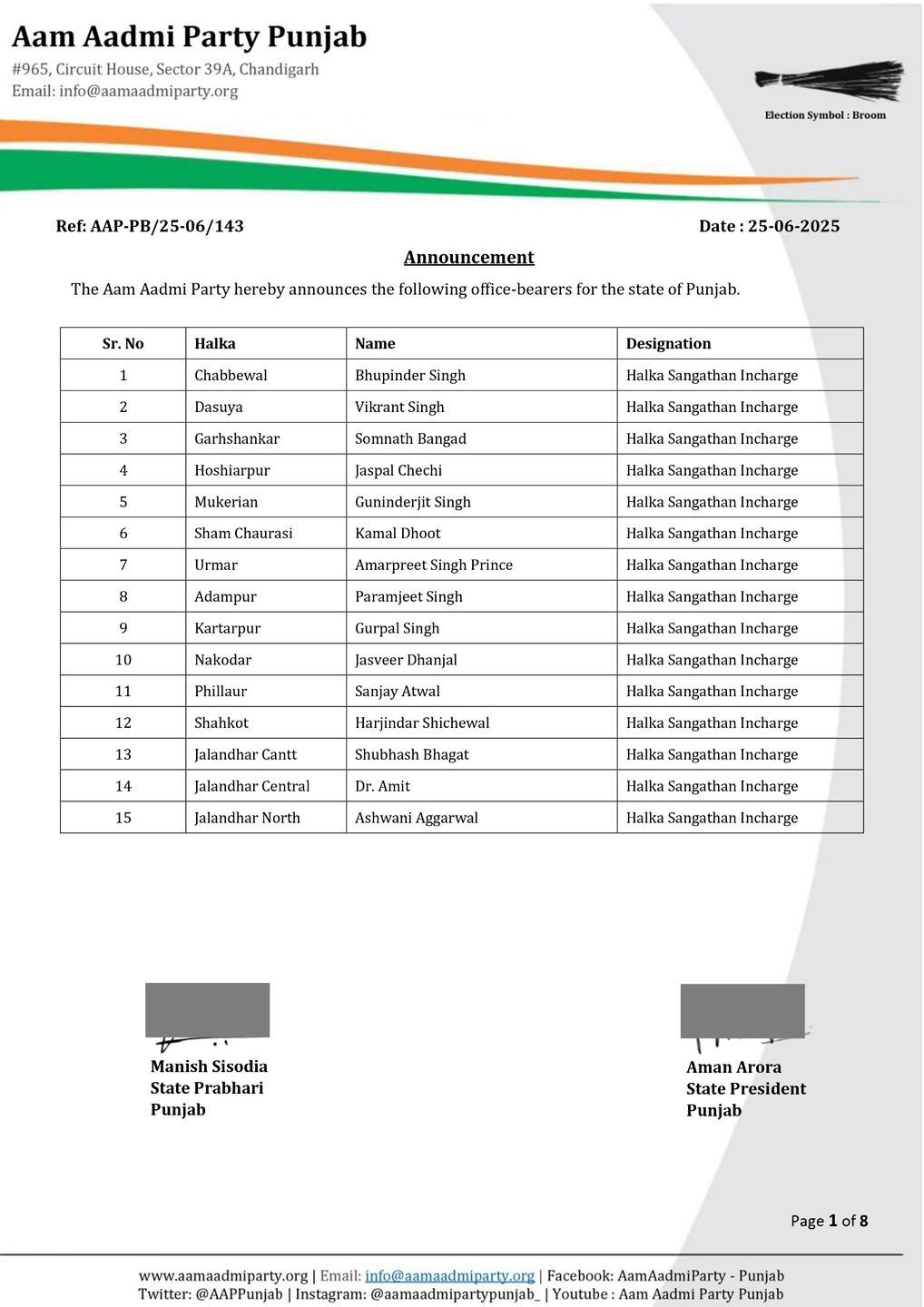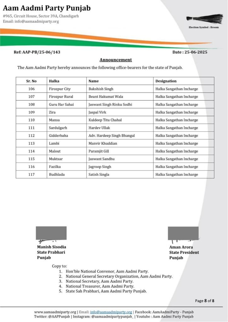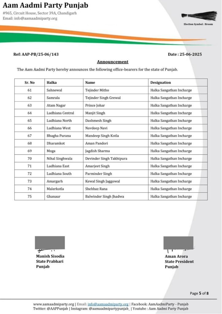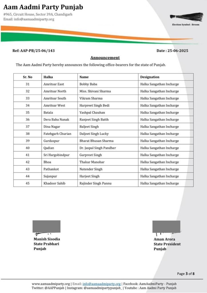 ਵੱਡੀ ਖ਼ਬਰ: AAP ਪੰਜਾਬ ਵੱਲੋਂ 117 ਨਵੇਂ ਹਲਕਾ ਇੰਚਾਰਜਾਂ ਦਾ ਐਲਾਨ, ਪੜ੍ਹੋ ਪੂਰੀ ਲਿਸਟ