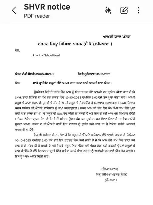 Buland kesari/Ludhiana Schools: ਲੁਧਿਆਣਾ ਦੇ ਜ਼ਿਲ੍ਹਾ ਸਿੱਖਿਆ ਅਧਿਕਾਰੀ ਨੇ ਜ਼ਿਲ੍ਹੇ ਦੇ 393 ਪ੍ਰਾਈਵੇਟ ਸਕੂਲਾਂ ਨੂੰ ਇੱਕ ਨੋਟਿਸ ਜਾਰੀ ਕੀਤਾ ਹੈ, ਜਿਸ ਵਿੱਚ ਉਨ੍ਹਾਂ ਨੂੰ ਦੁਪਹਿਰ 2 ਵਜੇ ਤੱਕ ਆਪਣਾ ਕਲੀਨ ਐਂਡ ਗ੍ਰੀਨ ਸਕੂਲ (SHVR) ਡੇਟਾ ਪੋਰਟਲ ‘ਤੇ ਜਮ੍ਹਾਂ ਕਰਵਾਉਣਾ ਪਵੇਗਾ। ਕਿਹਾ ਗਿਆ ਹੈ, ਨਹੀਂ ਤਾਂ ਉਨ੍ਹਾਂ ਦਾ NOC ਰੱਦ ਕਰ ਦਿੱਤਾ ਜਾਵੇਗਾ। ਜ਼ਿਲ੍ਹਾ ਸਿੱਖਿਆ ਵਿਭਾਗ ਵਿੱਕੀ ਤੋਂ ਛੋਟਾ ਨੋਟਿਸ ਮਿਲਣ ਤੋਂ ਬਾਅਦ ਪ੍ਰਾਈਵੇਟ ਸਕੂਲ ਸੰਚਾਲਕ ਘਬਰਾ ਗਏ ਹਨ।