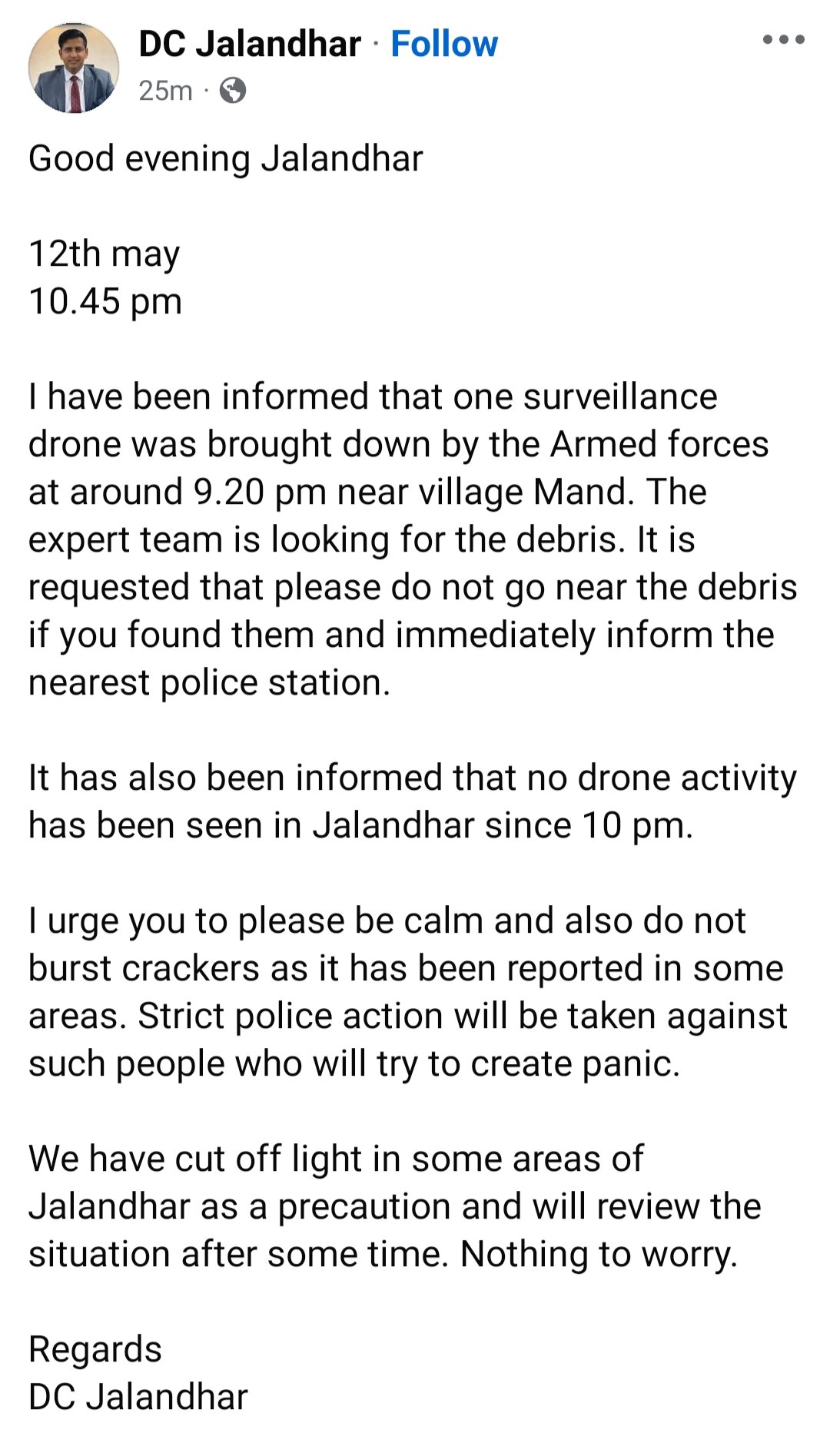 ਜਲੰਧਰ ਦੇ ਡੀਸੀ ਵੱਲੋਂ ਵੀ ਕਿਹਾ ਗਿਆ ਹੈ ਕਿ ਲੋਕ ਬਿਨਾਂ ਕਿਸੇ ਕੰਮ ਤੋਂ ਘਰੋਂ ਬਾਹਰ ਨਾ ਨਿਕਲਣ। ਉਹਨਾਂ ਕਿਹਾ ਕਿ ਹਾਲਾਤ ‘ਤੇ ਪ੍ਰਸ਼ਾਸਨ ਵੱਲੋਂ ਪੂਰੀ ਨਜ਼ਰ ਰੱਖੀ ਗਈ ਹੈ। ਕਿਸੇ ਵੀ ਤਰ੍ਹਾਂ ਦੀਆਂ ਅਫਵਾਵਾਂ ਮਗਰ ਲੱਗ ਕੇ ਪੈਨਿਕ ਫੈਲਾਇਆ ਨਾ ਕੀਤਾ ਜਾਵੇ। ਅਜਿਹੀਆਂ ਵੀ ਖਬਰਾਂ ਦੇ ਸਾਹਮਣੇ ਆਈਆਂ ਹਨ ਕਿ ਸੂਰਾਨੁਸੀ ਦੇ ਨਜ਼ਦੀਕ ਕਿਤੇ ਪਾਕਿਸਤਾਨੀ ਡਰੋਨ ਦੇਖਿਆ ਗਿਆ ਹੈ! ਪਰ ਇਸ ਦੀ ਪੁਸ਼ਟੀ ਨਹੀਂ ਕੀਤੀ ਗਈ।