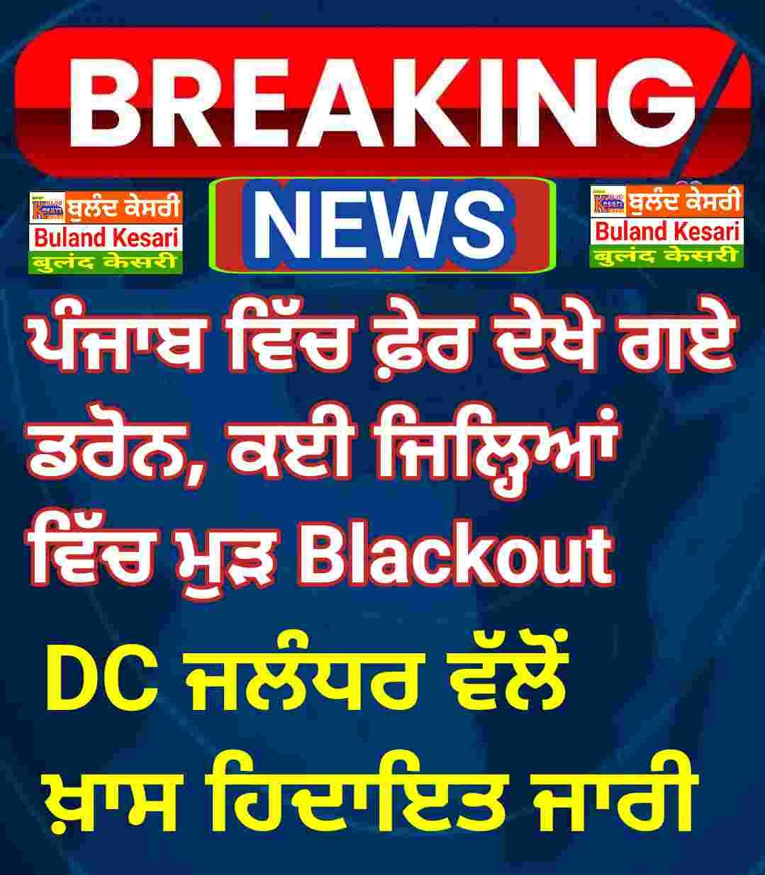 ਜੋ ਤਾਜ਼ਾ ਖਬਰਾਂ ਆ ਰਹੀਆਂ ਹਨ ਇਸਦੇ ਮੁਤਾਬਕ ਪਾਕਿਸਤਾਨ ਵੱਲੋਂ ਮੁੜ ਤੋਂ ਪੰਜਾਬ ਦੇ ਕੁਝ ਜਿਲ੍ਹਿਆਂ ਵਿੱਚ ਡਰੋਨ ਅਟੈਕ ਕੀਤੇ ਜਾਂਣ ਦੀਆਂ ਸੂਚਨਾਵਾਂ ਸੋਸ਼ਲ ਮੀਡੀਆ ‘ਤੇ ਵਾਇਰਲ ਹੋ ਰਹੀਆਂ ਹਨ! ਇਸ ਦੇ ਨਾਲ ਹੀ ਇਹ ਵੀ ਚਰਚਾ ਹੈ ਕਿ ਪੰਜਾਬ ਦੇ ਕੁਝ ਜਿਲਿਆਂ ਜਿਵੇਂ ਹੁਸ਼ਿਆਰਪੁਰ, ਅੰਮ੍ਰਿਤਸਰ ਪਠਾਨਕੋਟ ਵਿੱਚ ਇੱਕ ਵਾਰ ਫਿਰ ਤੋਂ ਬਲੈਕਆਉਟ ਦੇ ਆਦੇਸ਼ ਦਿੱਤੇ ਗਏ ਹਨ!